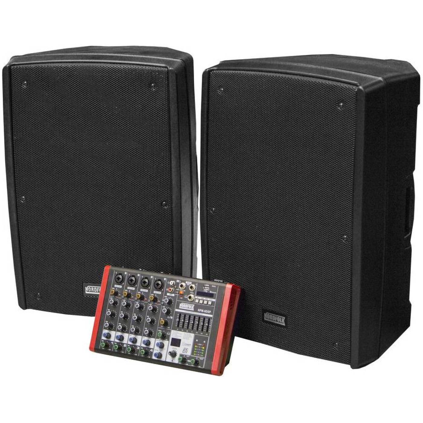 NORDFOLK MS15 MKII мобильный звуковой комплект, 1200 Вт, 2 х АС + активный микшерный пульт, MP3, Bluetooth + акустические стойки.