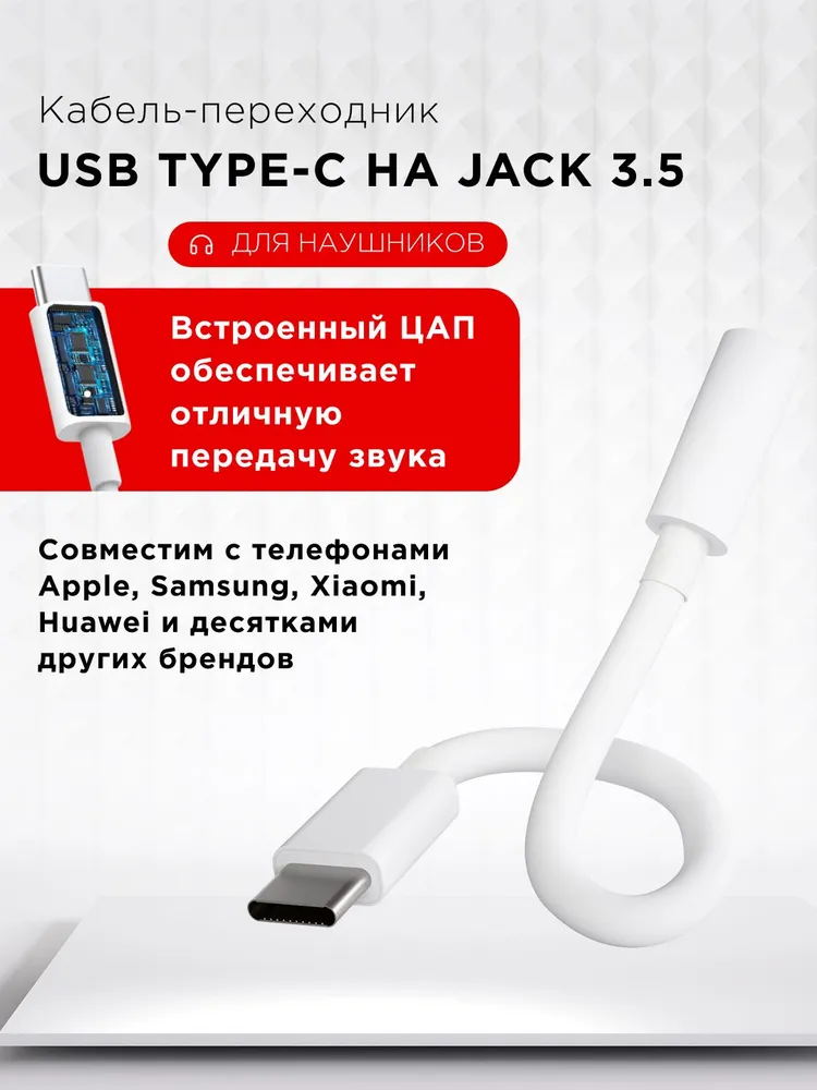 USB Type-C на Jack 3.5. Кабель-переходник (адаптер) / Кабель AUX для наушников.